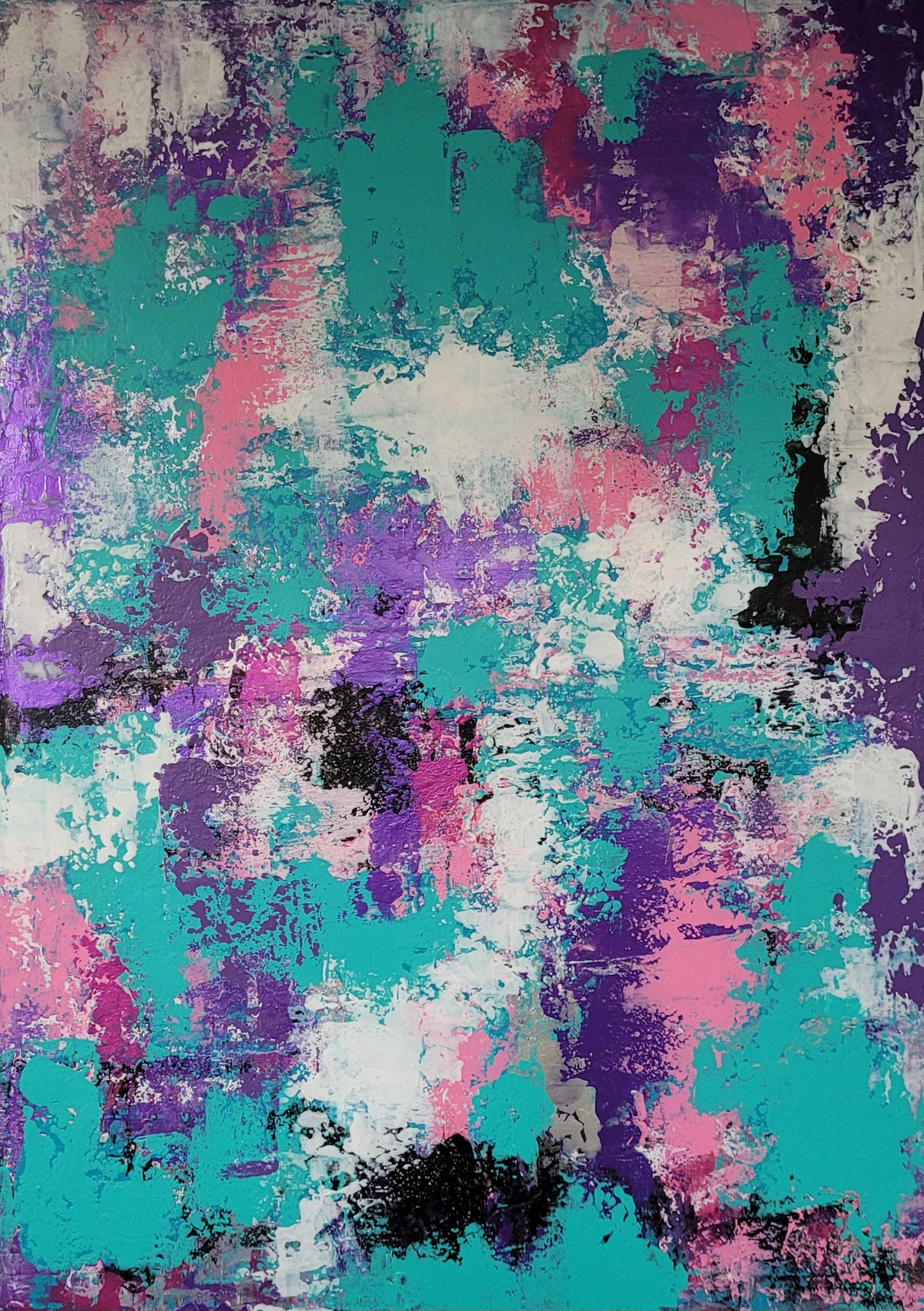 Die türkisblauen, lilafarbenen und rosafarbenen Nuancen, die durch feine Gold- oder hier Silberakzente ergänzt werden, schaffen lebendige Kunstwerke, die dich zum Träumen einladen.